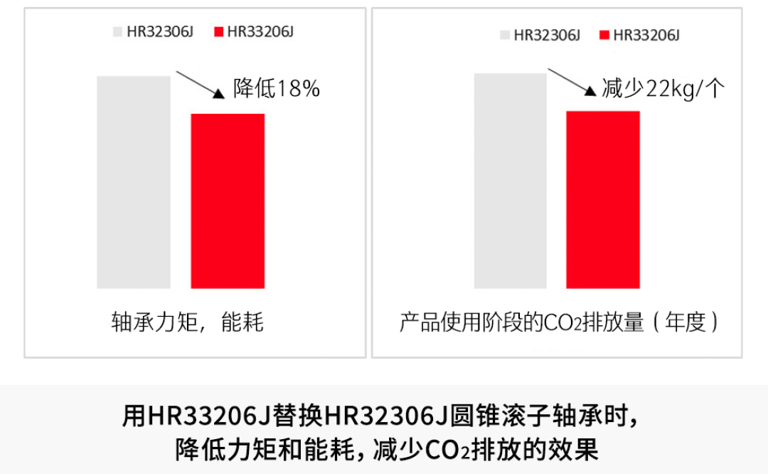 例:圓錐滾子軸承HR32306J可用較小的HR33206J代替。據估計,更換后軸承力矩和能耗可降低約18%,在產品使用階段每年可節約電能*4 約48kWh,相當于減少CO2排放量*4 約22kg。