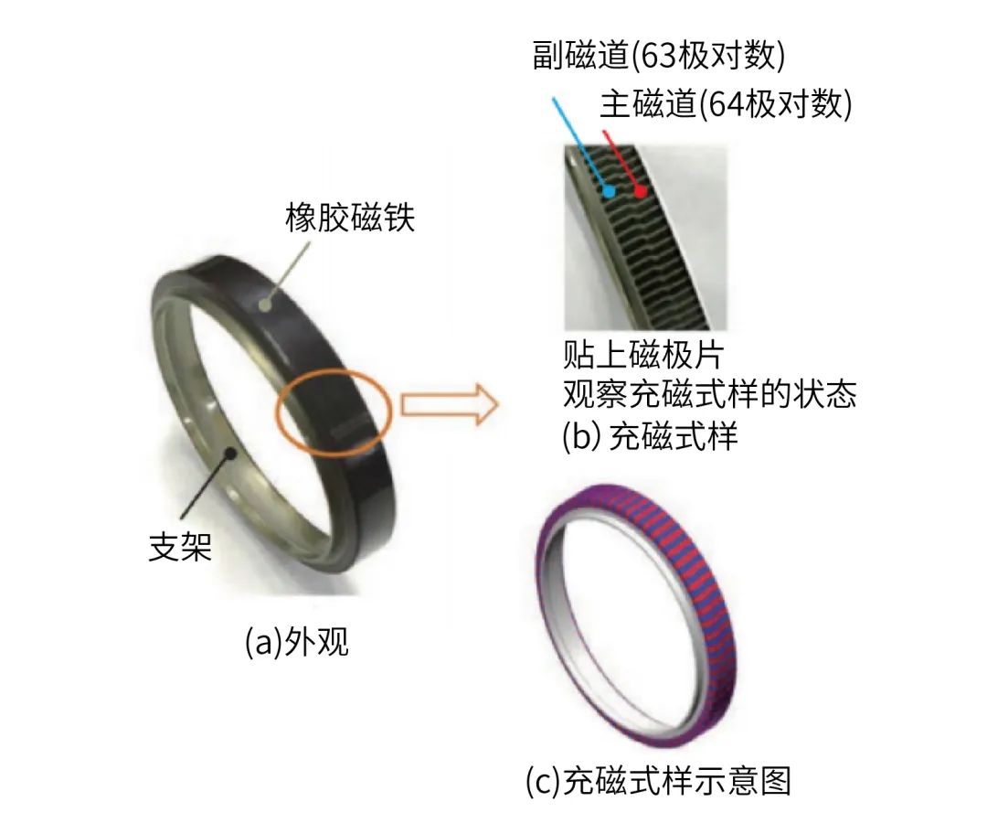 NTN開發(fā)的雙列磁環(huán)3)如圖4所示,它和磁性傳感器組合使用可用于檢測絕對(duì)角度。磁性傳感器的倍增功能和雙列磁環(huán)的高精度充磁式樣使其能夠以旋轉(zhuǎn)1圈(360度)達(dá)到10萬等分以上的分辨率進(jìn)行檢測。由于它是磁力式的,相比光學(xué)式傳感器,具有優(yōu)異的耐污染性能,并且其緊湊的配置有利于節(jié)省空間,被用在機(jī)器人關(guān)節(jié)部位或用于各類電機(jī)的控制傳感器。
