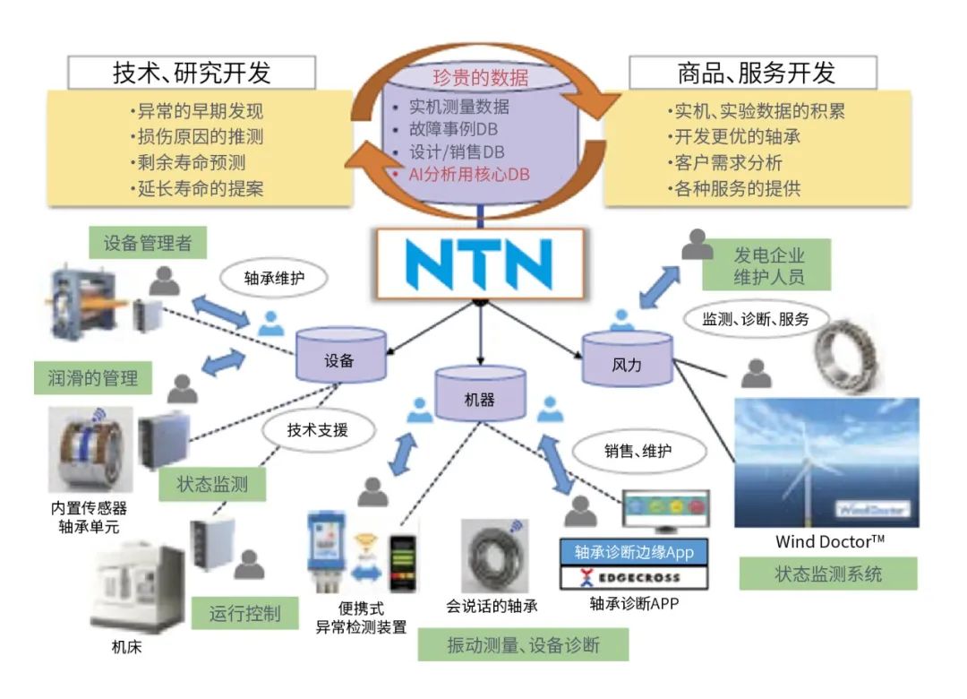 在支持人類生活活動(dòng)的各種設(shè)備中,滾動(dòng)軸承是組裝于其中的機(jī)械要素部件。由于機(jī)械部件的故障造成設(shè)備停止運(yùn)行會(huì)導(dǎo)致利益損失,為了防止出現(xiàn)這些故障情況,監(jiān)測軸承周邊的溫度、振動(dòng)非常重要。NTN將軸承和傳感機(jī)能融合開發(fā)了帶傳感器軸承,并且致力于提供軸承的狀態(tài)監(jiān)測服務(wù)。根據(jù)監(jiān)測到的信息,面向客戶遇到的問題,提供有效的服務(wù)和解決方案。