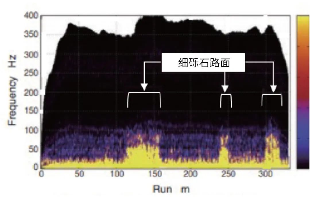 車輪旋轉(zhuǎn)信號(hào)包括輪胎狀況(氣壓等)和路面狀況的影響。通過分析高分辨率的旋轉(zhuǎn)信號(hào),我們可以更準(zhǔn)確地檢測輪胎狀況和路面狀況的差異。例如,當(dāng)經(jīng)過一段礫石覆蓋的瀝青路時(shí),轉(zhuǎn)速變動(dòng)頻譜如圖3所示。使用這種高分辨率信號(hào)可以進(jìn)一步增強(qiáng)汽車控制的功能。