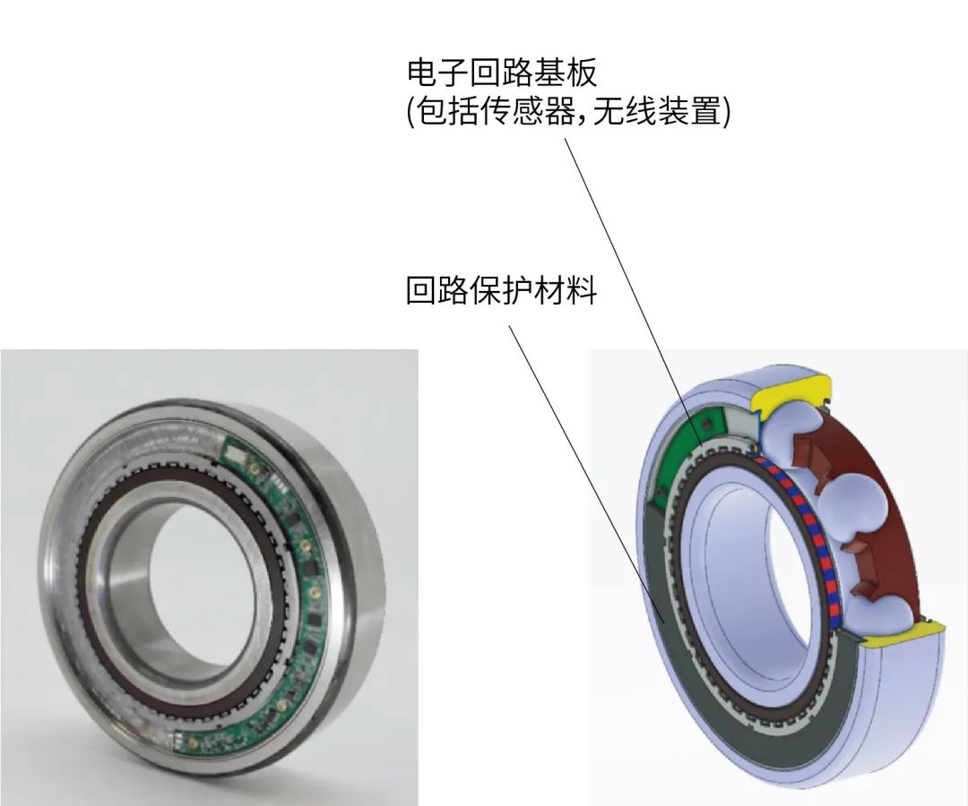 NTN開發(fā)了內(nèi)置傳感功能的優(yōu)化軸承【會(huì)說話的軸承】(圖6)。該軸承與標(biāo)準(zhǔn)型號(hào)的軸承具有相同外形尺寸,內(nèi)部集成了振動(dòng)、溫度、旋轉(zhuǎn)傳感器以及發(fā)電機(jī)、信號(hào)處理回路、無線通信單元。軸承通過旋轉(zhuǎn)發(fā)電并將檢測到的結(jié)果進(jìn)行無線傳輸,因此該軸承可以通過自己的話語來傳達(dá)信息。